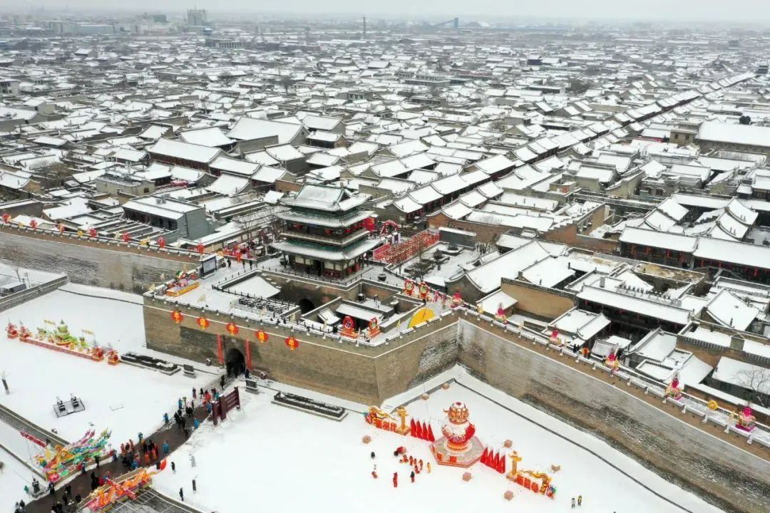 1月14日拍摄的山西平遥古城雪景(无人机照片)。新华社发(梁生仁 摄)