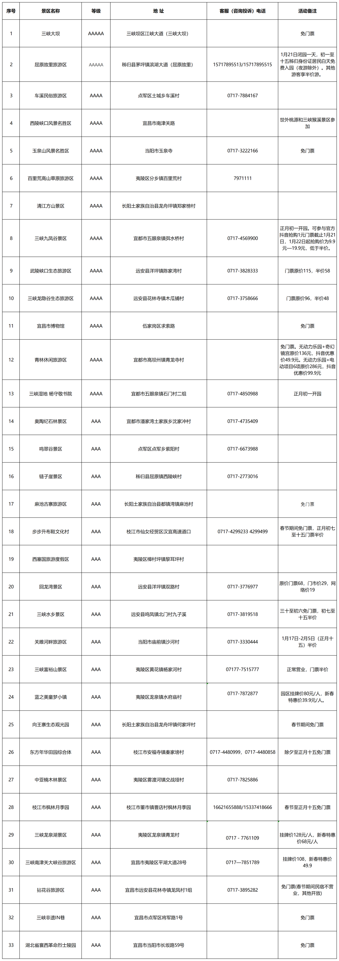 新春将至,宜昌各大景区集体为广大市民游客准备了丰富的活动和优惠:除夕至正月十五,全市33家A级景区面向所有游客大门票半价或免费。年卡使用情况可关注景区公告。