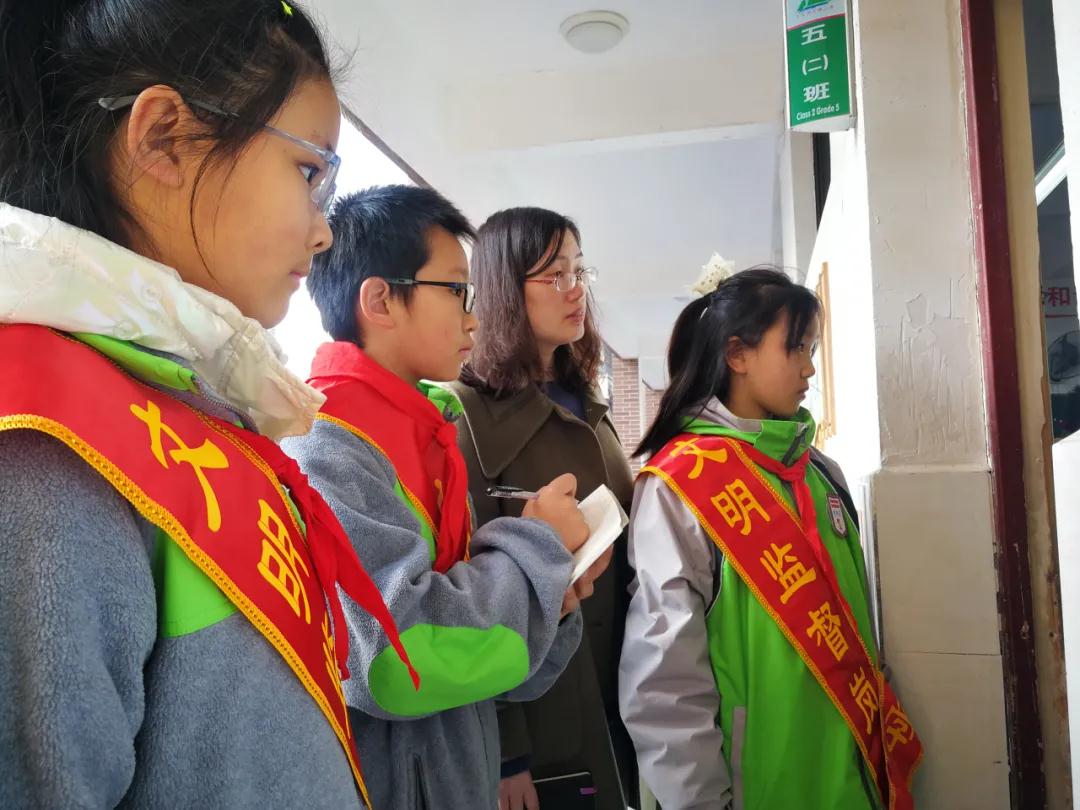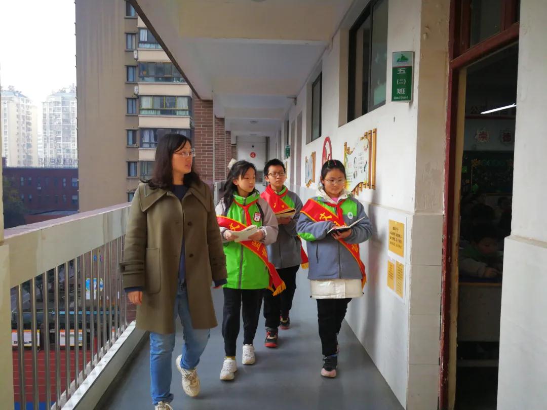 21日课间,黄石市湖滨路小学3名身披“文明监督岗”绶带的学生在教师张双凤的带领下,对校园、教室开展安全文明检查:楼道、教室卫生是否整洁,学生、教师举止是否文明。