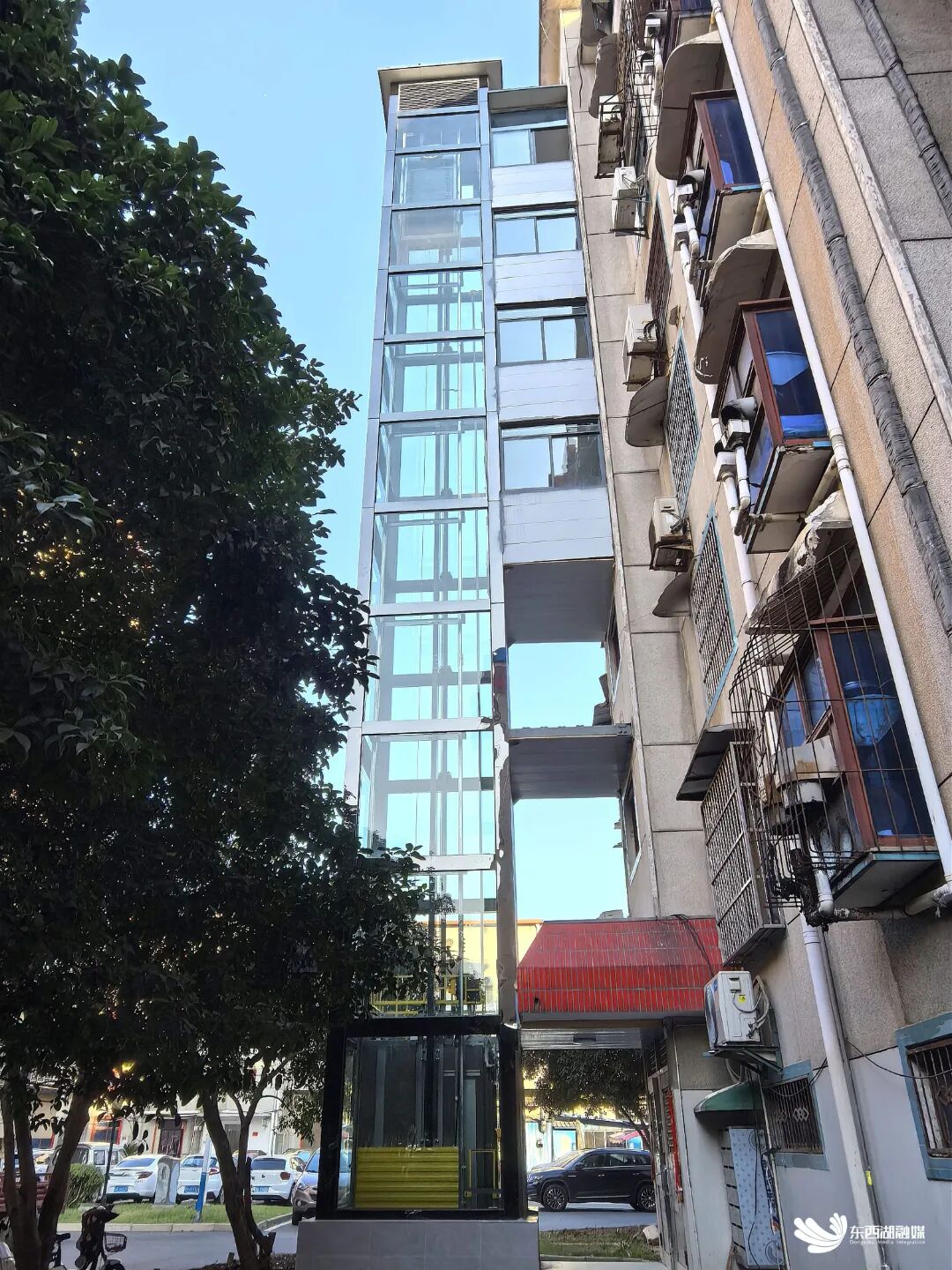 记者看到,7层高的楼房外墙略显老旧,单元门口一部灰色钢结构的新电梯直通楼顶,“守护”在楼体旁。大面积透明玻璃,在蓝天和秋色的衬托下,时尚的外形格外吸睛。