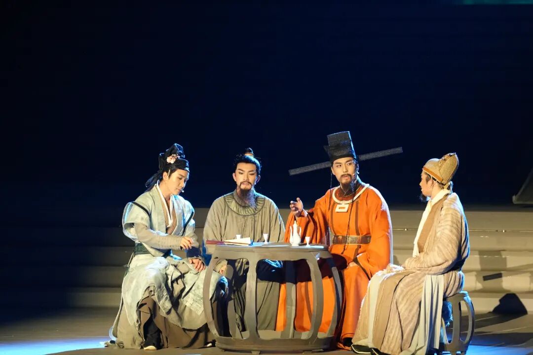 若说《从此东坡》是“水上东坡”,江山明月剧场的《大江东去》便是“山水间的东坡”。剧场借鉴宋画,20米高假山舞台与复刻的东坡赤壁二矶头,让观众直面“江山如画”。“会挽雕弓如满月”吟唱时,舞台上方烈焰如赤龙破空,将豪迈具象为视觉奇观。
