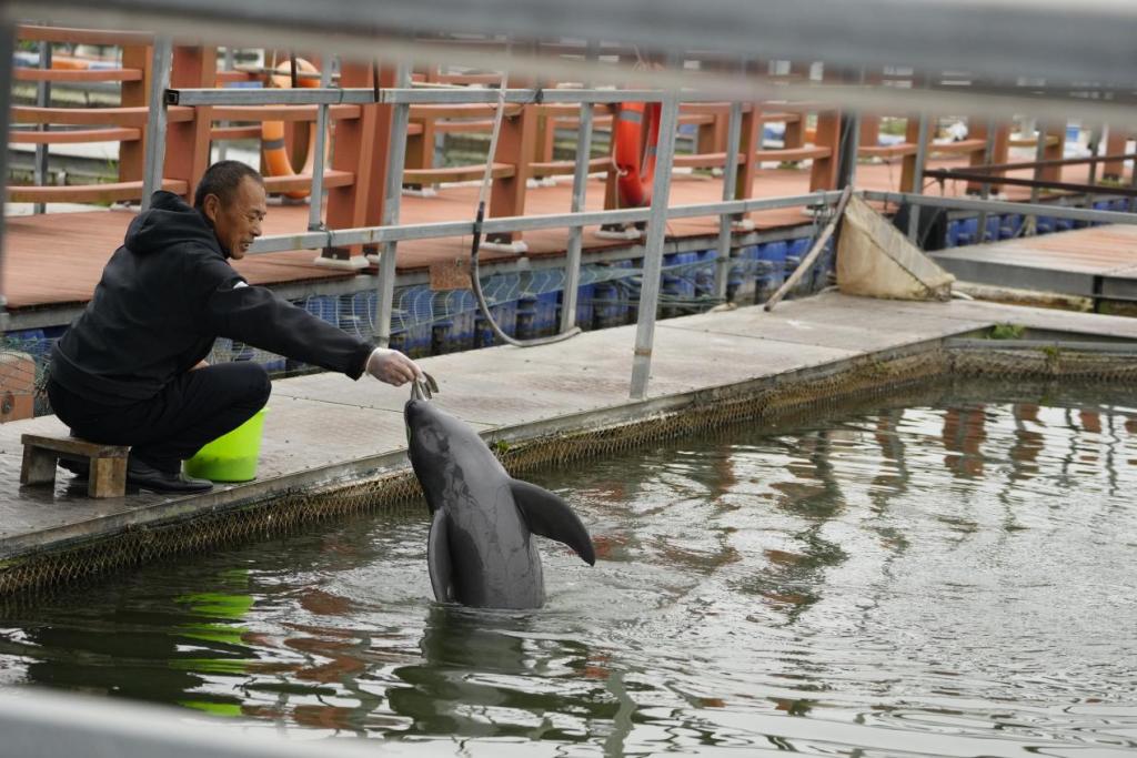 江豚是长江生态系统的指示物种,头部圆润,吻部微翘如微笑,故称“长江的微笑”。保护区饲养员丁泽良曾是第三代渔民,长江大保护让他“洗脚上岸”,成为江豚“奶爸”。
