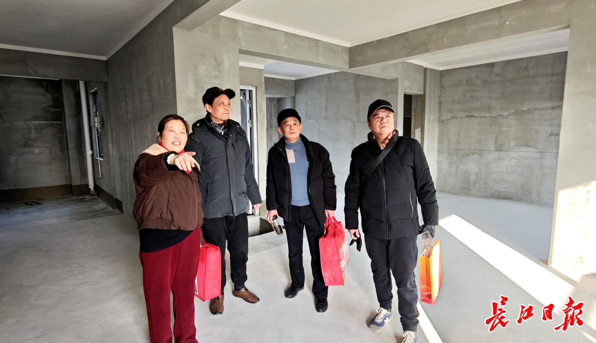 缪伟(右一)参观老街坊的新房。 记者何晓刚 摄