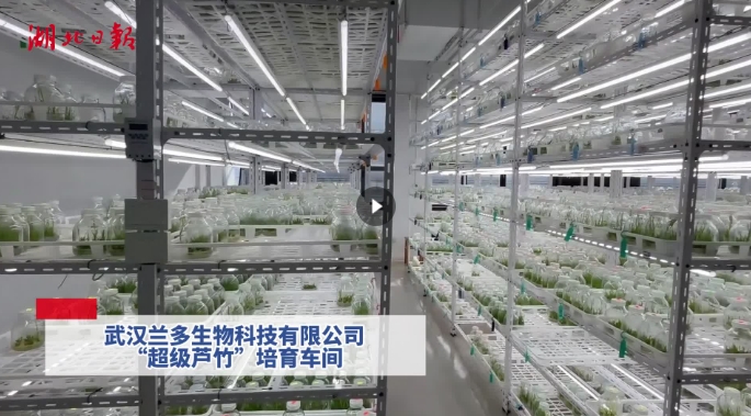 1月14日,湖北日报全媒记者走进武汉市黄陂区临空经济产业示范园,在武汉兰多生物科技有限公司(以下简称“兰多生物”)培育车间,只见白色高架整齐排列,成千上万个玻璃瓶里,装着1至6厘米高的翠绿小幼苗。