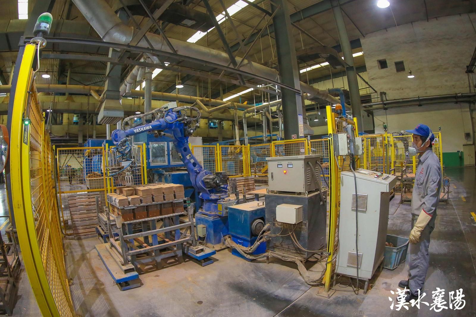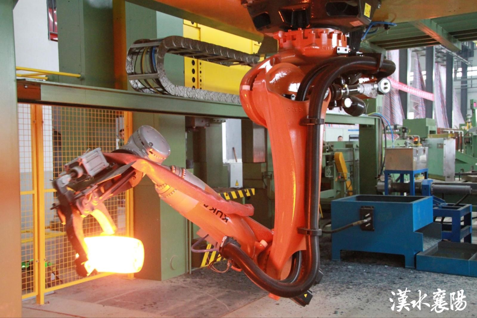 ▲湖北三环锻造有限公司(简称三环锻造)数字化生产车间,工业机器人伸展灵活的臂膀,精准夹起通红的锻件