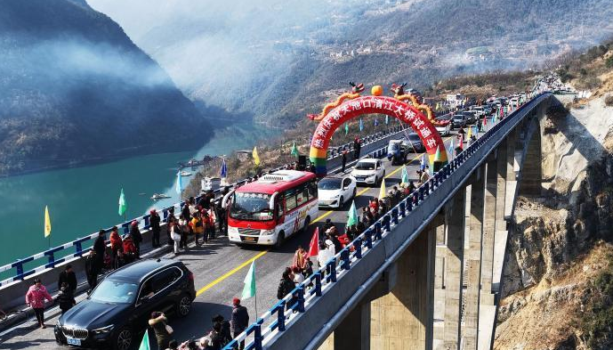 随着首批车辆缓缓驶过桥面,早早守候在现场的群众顿时沸腾了。喜庆的鞭炮声在山谷中回荡,人们纷纷举起手机,争相记录这盼望已久的场景。