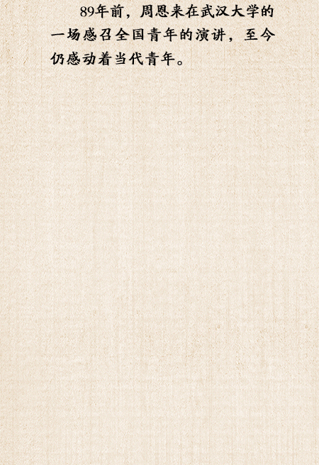 “我们中国的青年,不仅要在救亡的事业中复兴民族,而且要担负起将来建国的责任。”89年前,周恩来在武汉大学的一场感召全国青年的演讲,至今仍感动着当代青年。