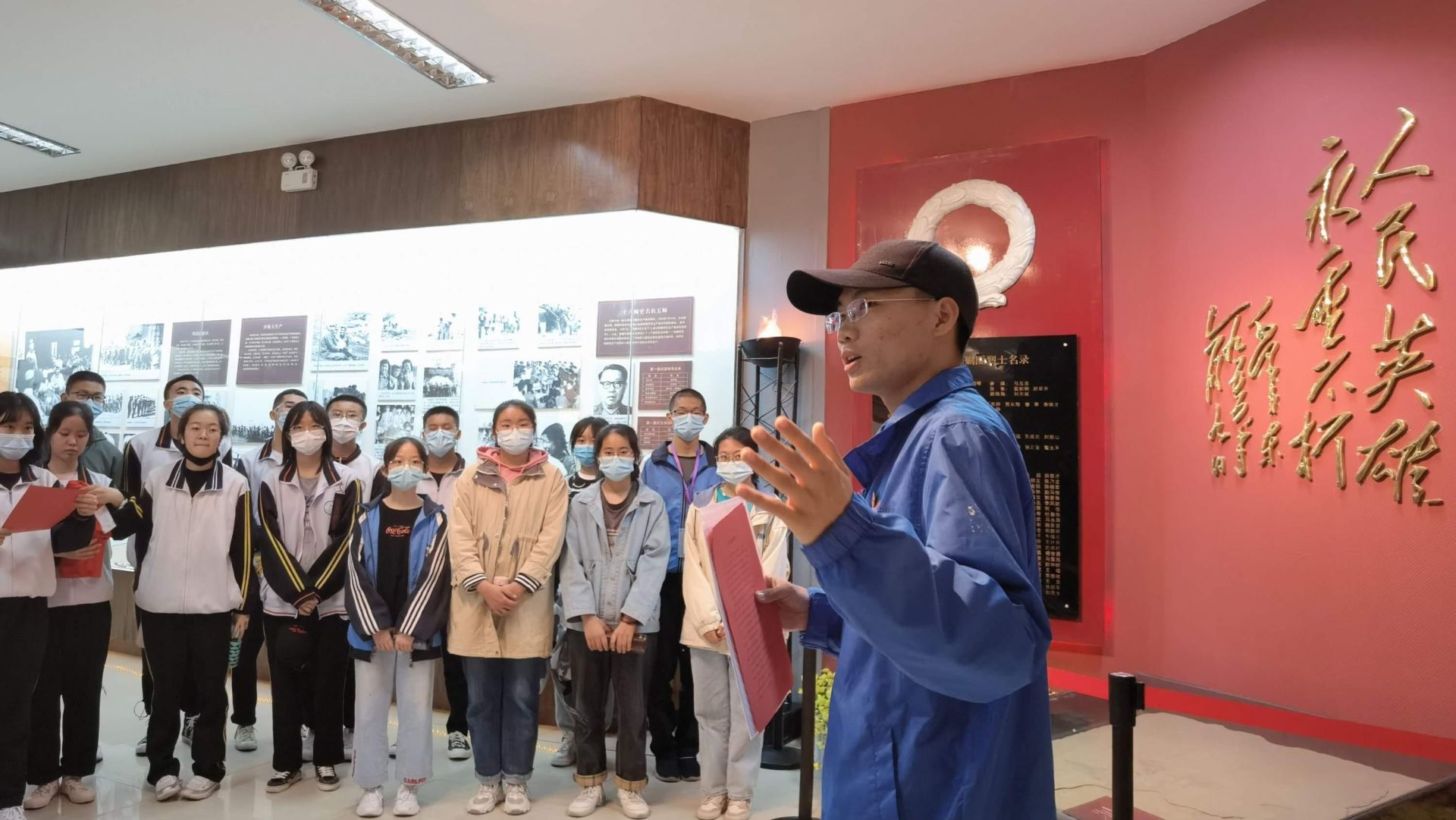 王强(右一)在志愿服务期间,带领新疆学生走进第五师红星之旅陈列馆。 本人供图