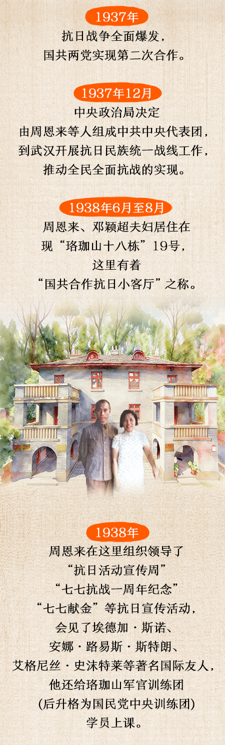 1937年,抗日战争全面爆发,国共两党实现第二次合作。1937年12月,中央政治局决定由周恩来等人组成中共中央代表团,到武汉开展抗日民族统一战线工作,推动全民全面抗战的实现。1938年6月至8月,周恩来、邓颖超夫妇居住在现“珞珈山十八栋”19号。